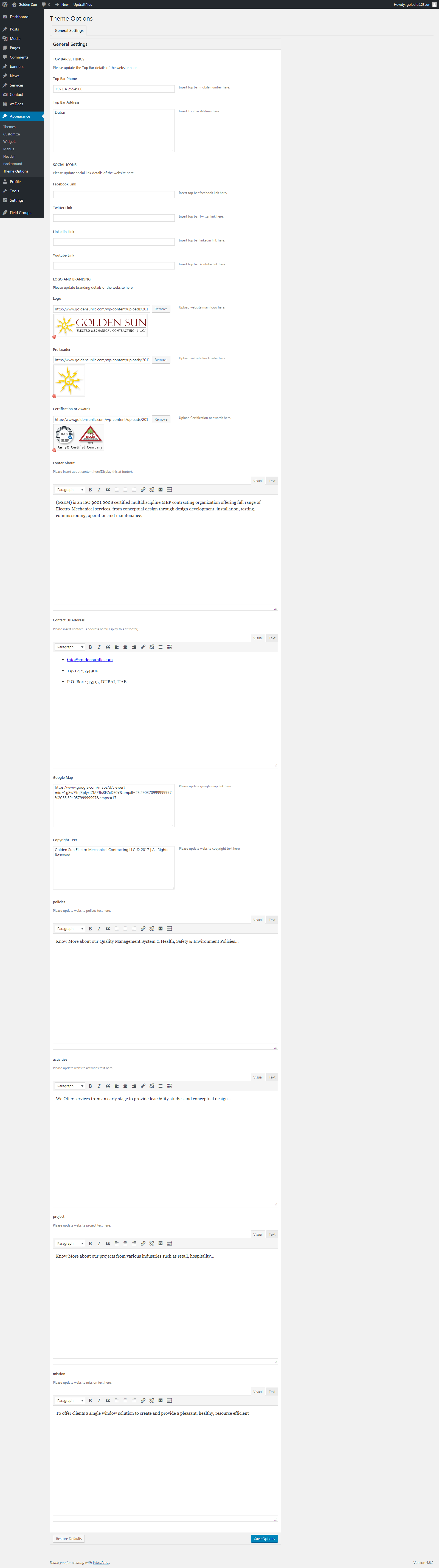 Top bar details such as phone and address of the website, site logo, preloader, certification or awards, policies, activities, projects and mission text under banner and footer content such as about content, contact address, google map and copyright text can be updated by Appearance -> Theme Options.